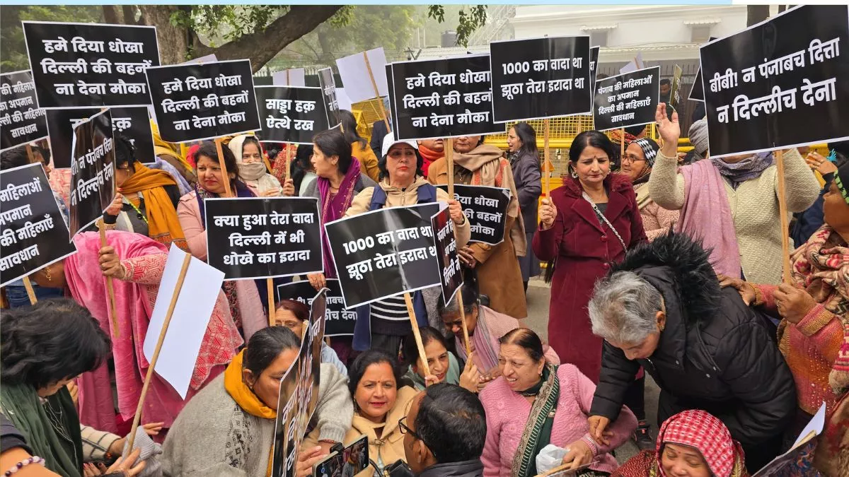 पंजाब की महिलाओं के एक समूह ने शनिवार को विरोध प्रदर्शन किया। प्रदर्शनकारियों ने आप के नेतृत्व वाली पंजाब सरकार पर हर महिला को 1000 रुपये देने के वादे से पीछे हटने का आरोप लगाया।